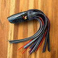 This lure was made by KEGZ. He is the grandson of Joe Yee and every lure is made in the same workshop, using the same materials and molds as the originals. This particular head is a dark blue tint glitterbomb super plunger with bejeweled eyes and skirted with Frothy "A La Vive" Dark Skipjack and Moldcraft Tuff Tails.
