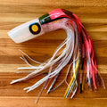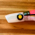 This lure was made by KEGZ. He is the grandson of Joe Yee and every lure is made in the same workshop, using the same materials and molds as the originals. This particular head is a white pearl with yellow resin eyes and skirted with Blue Ocean Mfg. World Cup Pattern Rubber Skirts.