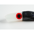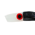 This lure was made by KEGZ. He is the grandson of Joe Yee and every lure is made in the same workshop, using the same materials and molds as the originals. This particular head is a white pearl with red resin eyes and skirted with our in-house black glitter sparkle vinyl and Moldcraft Tuff Tails.